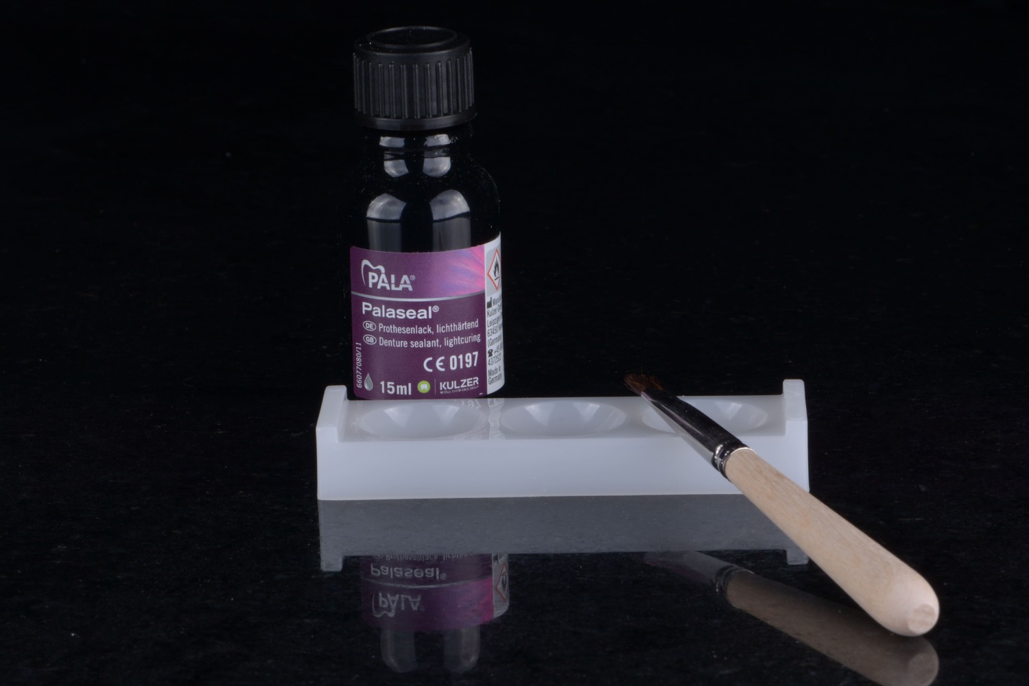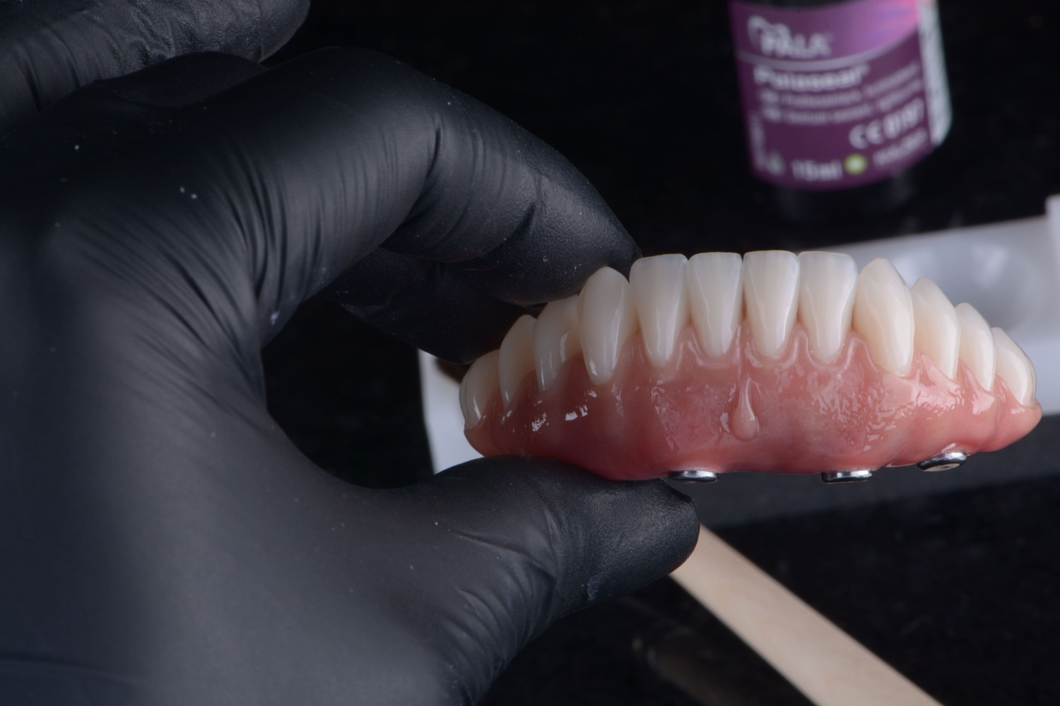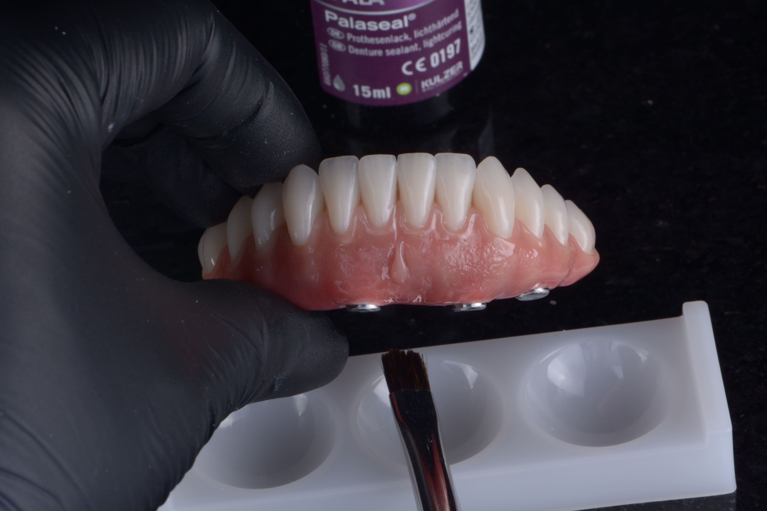 O primeiro é o Palabond, um agente de união que evita o deslocamento dos dentes da base da prótese. Ele é aplicado nos dentes com um pincel sem ponteira metálica antes de iniciar a acrilização. Ele potencializa a adesão entre a resina e o dente acrílico, proporcionando maior estabilidade e segurança sem a necessidade de retenção mecânica, união permanente e livre de falhas. O uso adequado do agente de união transparente Palabond faz dentes artificiais que se soltam da base da prótese, uma coisa do passado.
