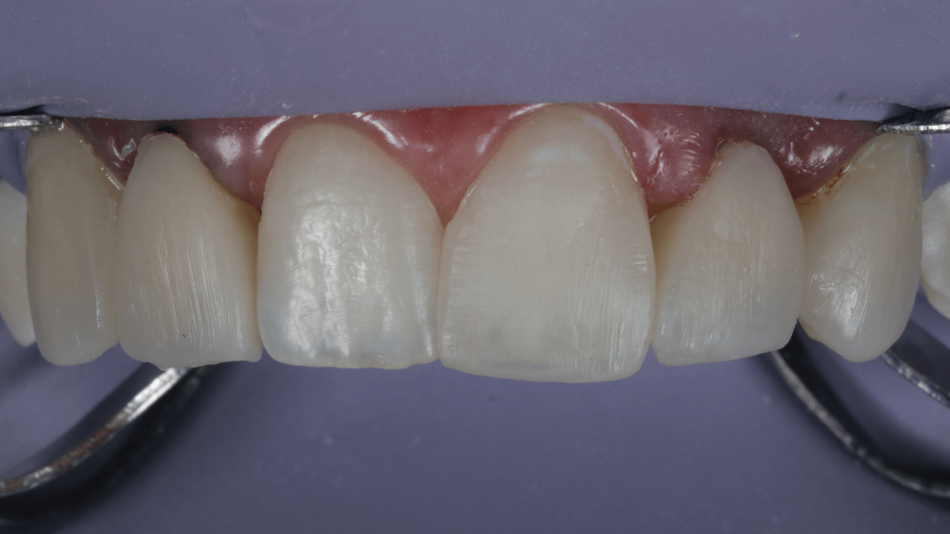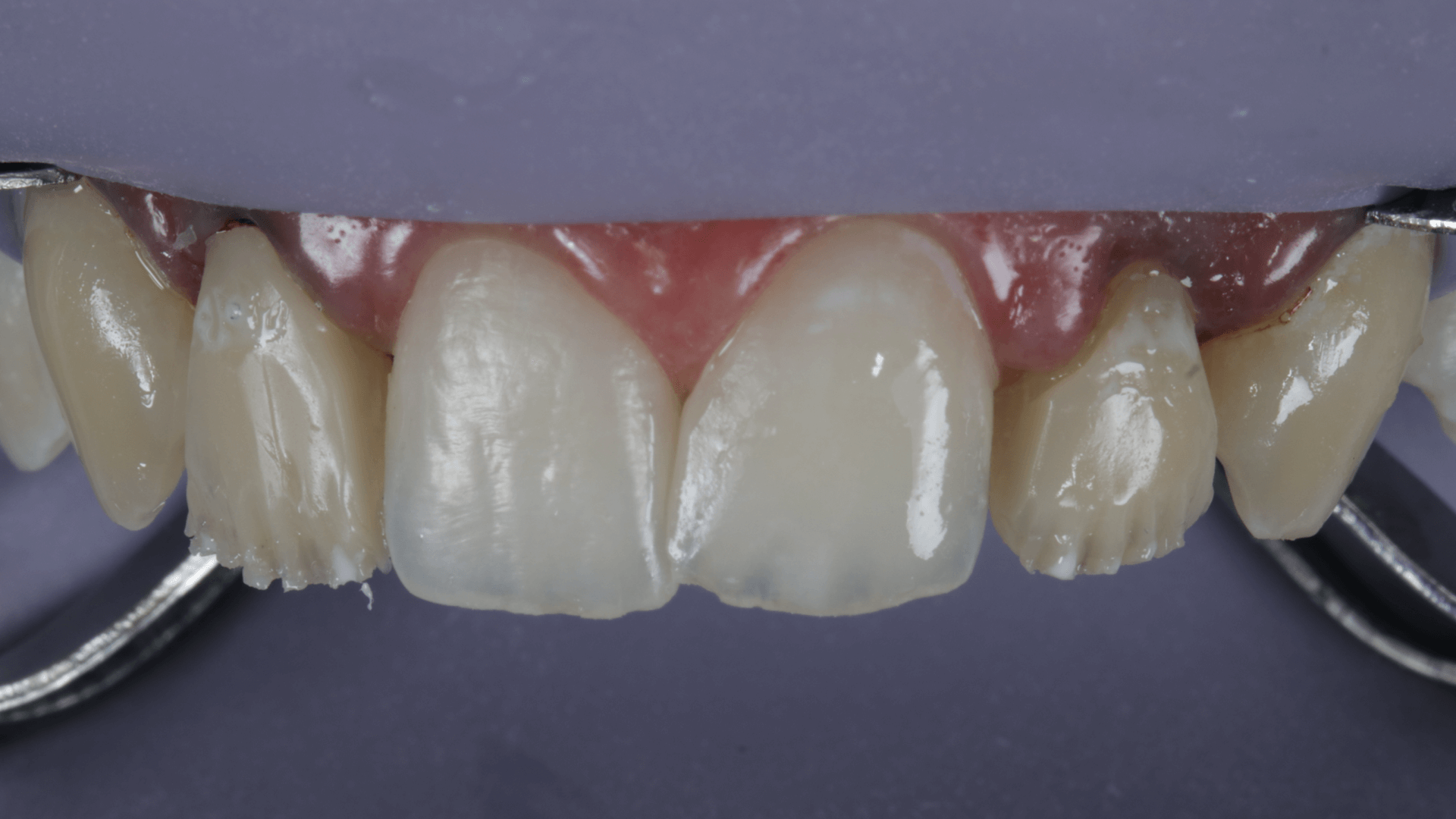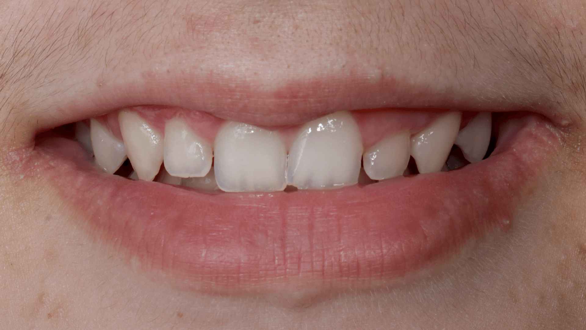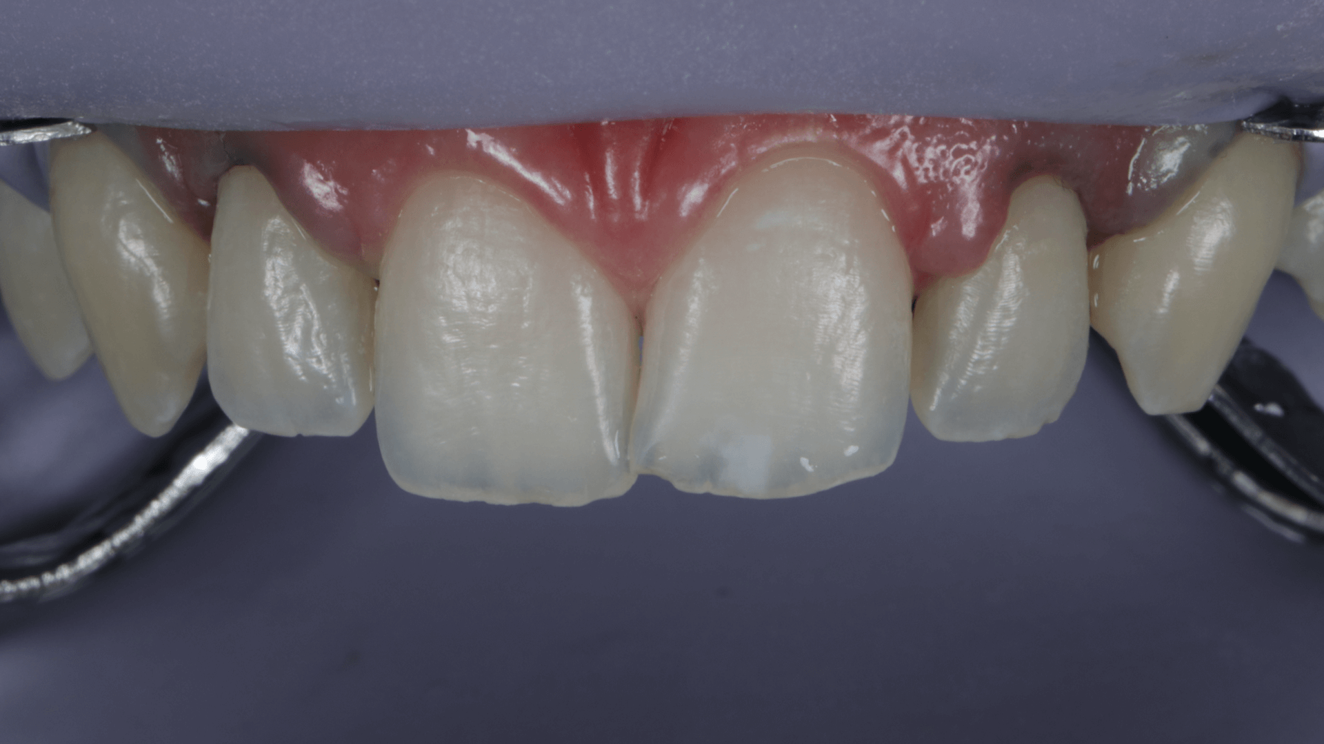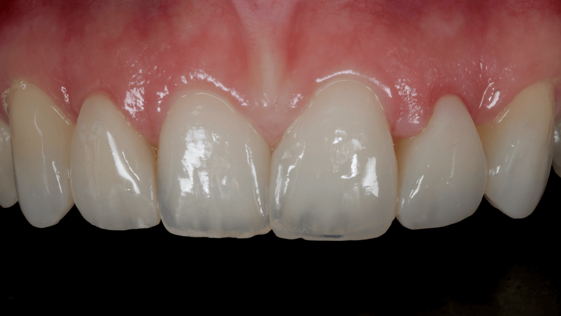 Paciente foi referida para correção da desarmonia dento gengival da região anterior. Na avaliação clínica foi percebido um desalinhamento dos zênites gengivais e alteração de forma dos incisivos laterais e presença de diastemas. Foi proposto e executado para a paciente cirurgia periodontal para aumento de coroa clínico e confecção de facetas diretas de resina composta, neste caso a Filtek™ Z350 XT.