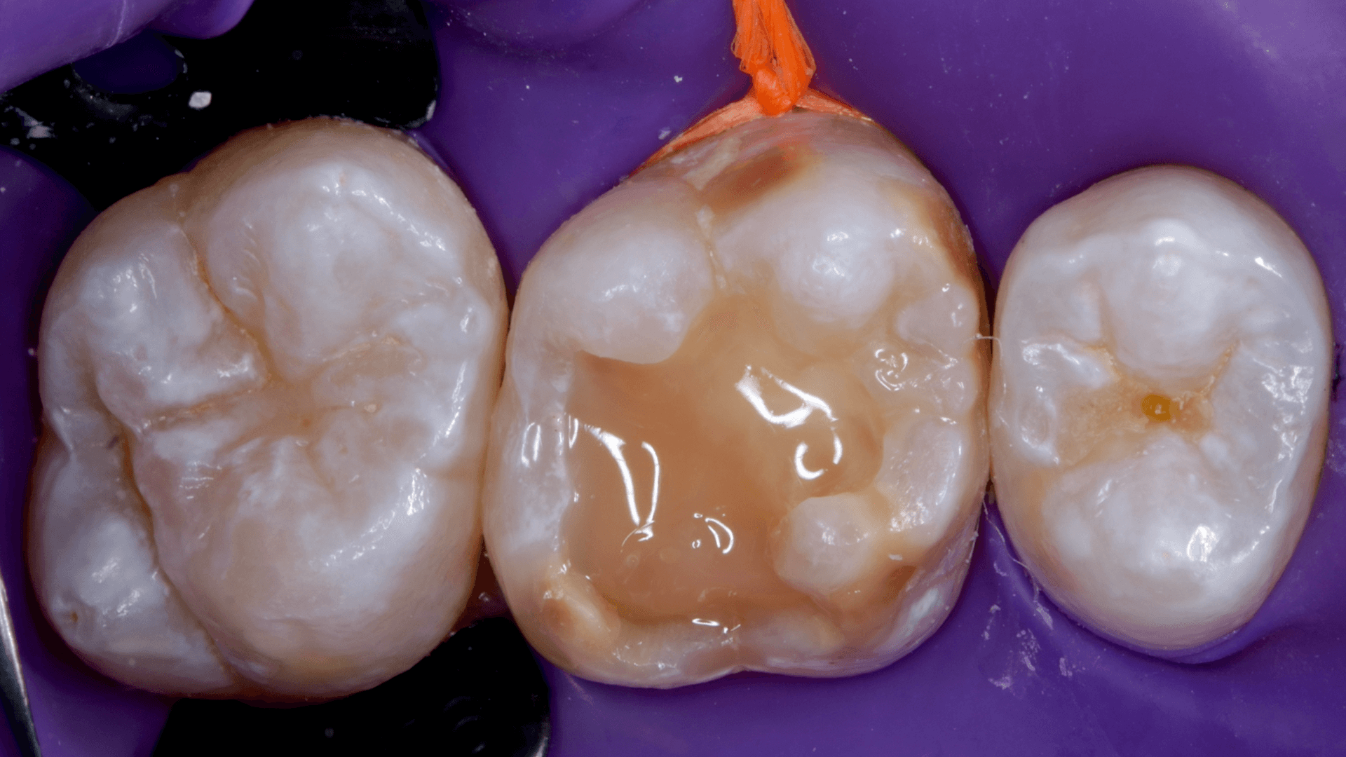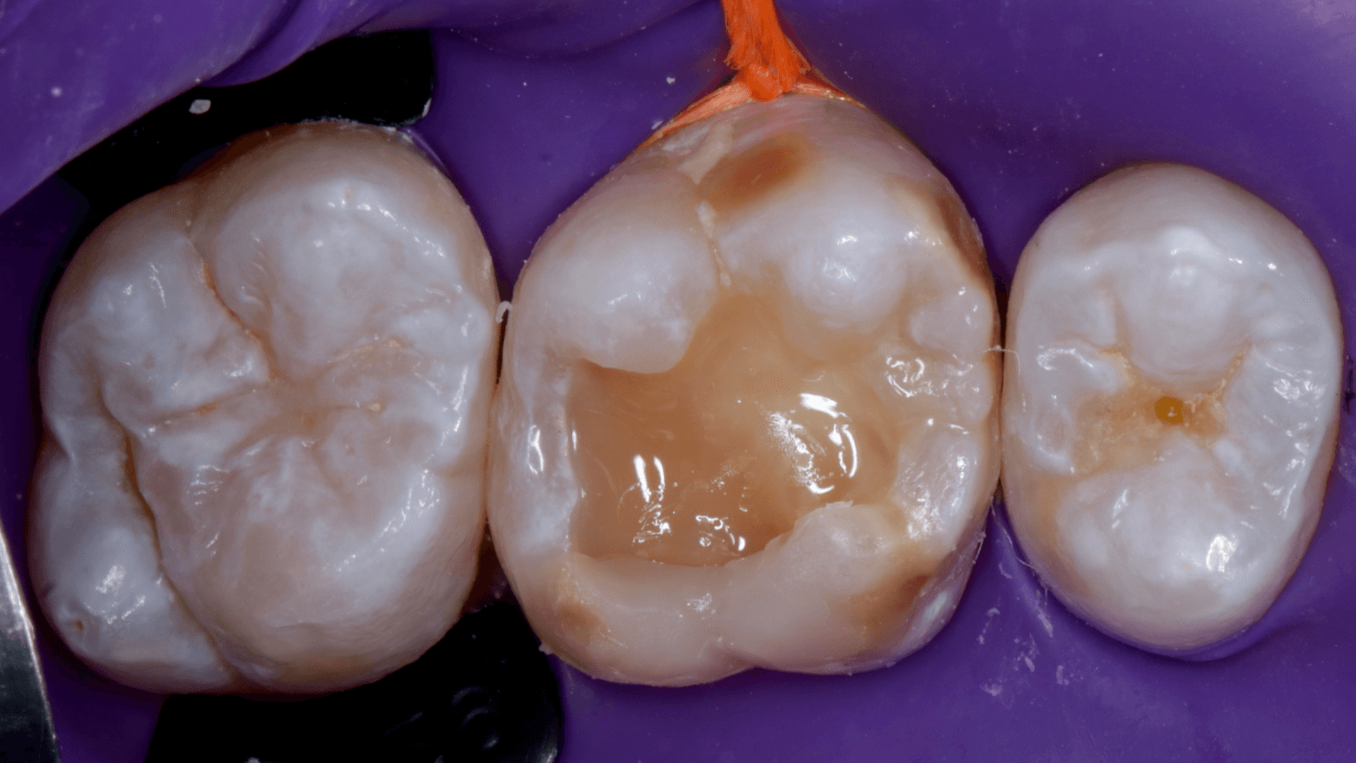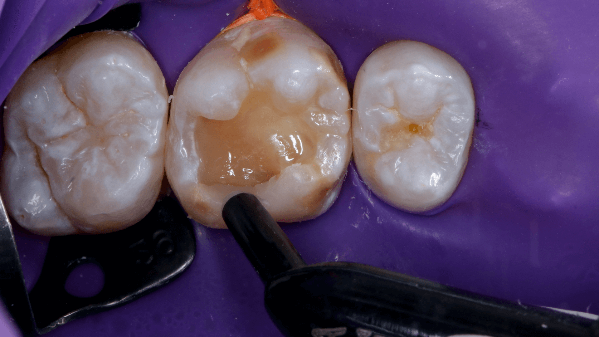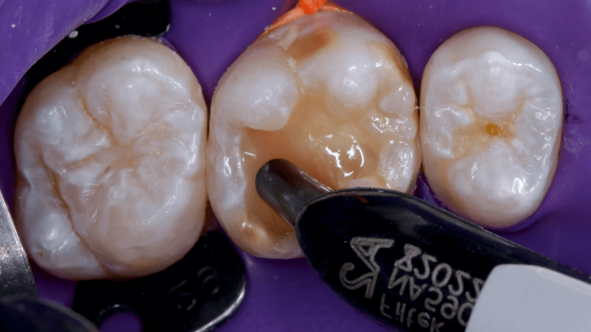 A dificuldade consistiu em restaurar o dente em questão em um curto tempo hábil, para isto foi selecionado materiais que permitem um preenchimento rápido e volumoso da porção central do dente (FiltekMR Bulkfill Flowable) associado a uma resina que possui propriedades de escultura, acabamento e polimento excelentes (Flowable e FiltekMR Universal).