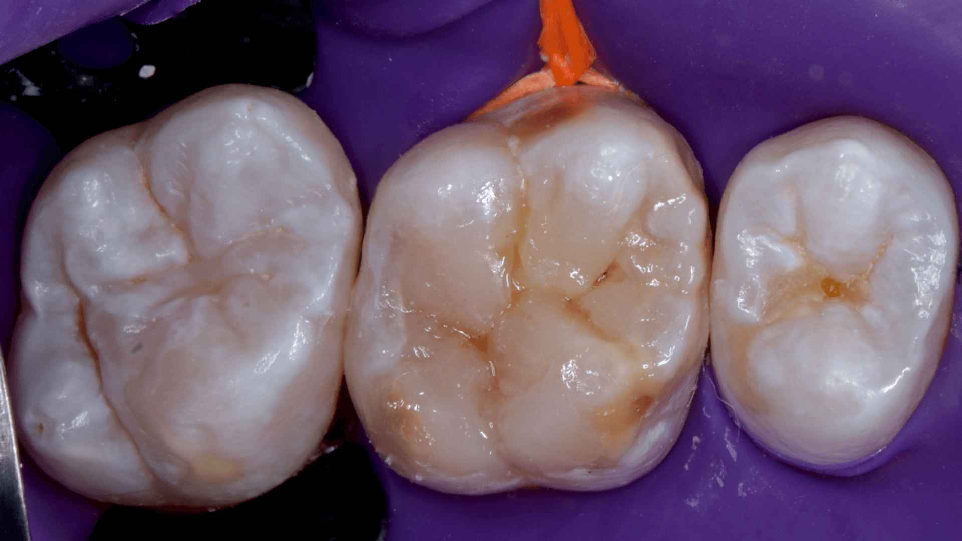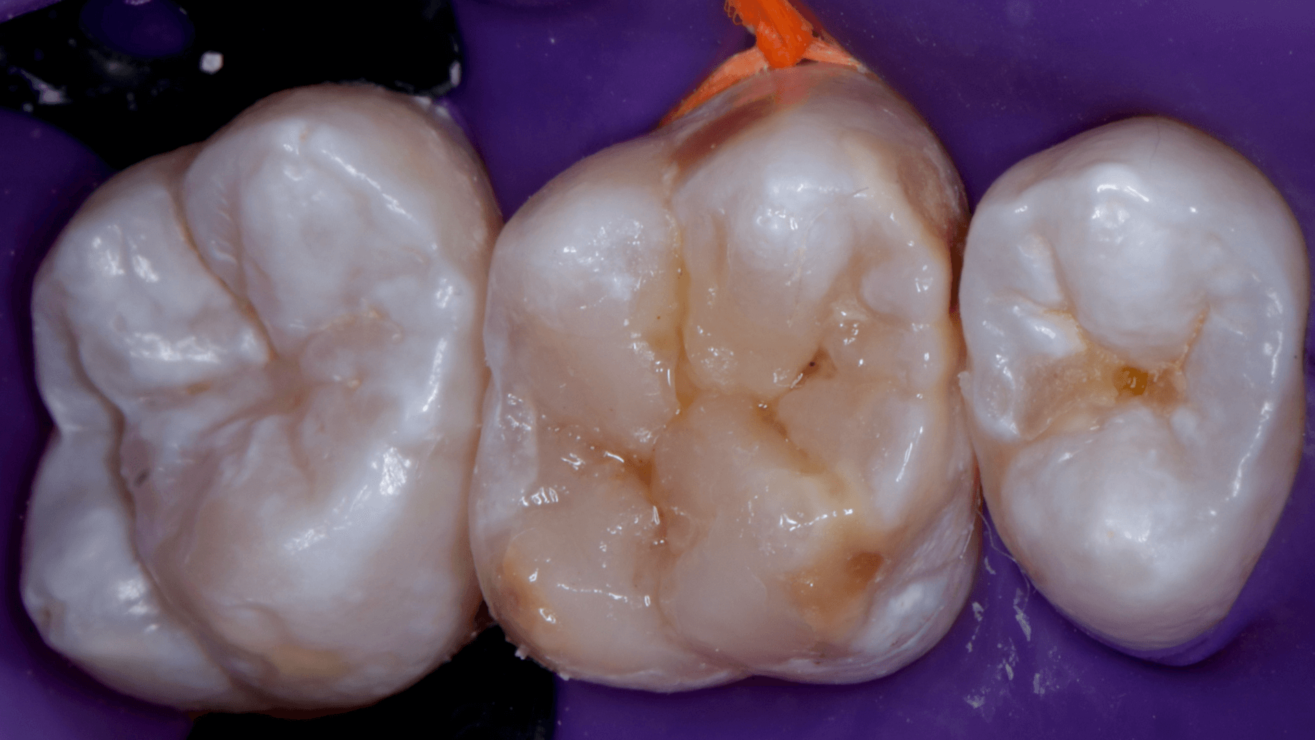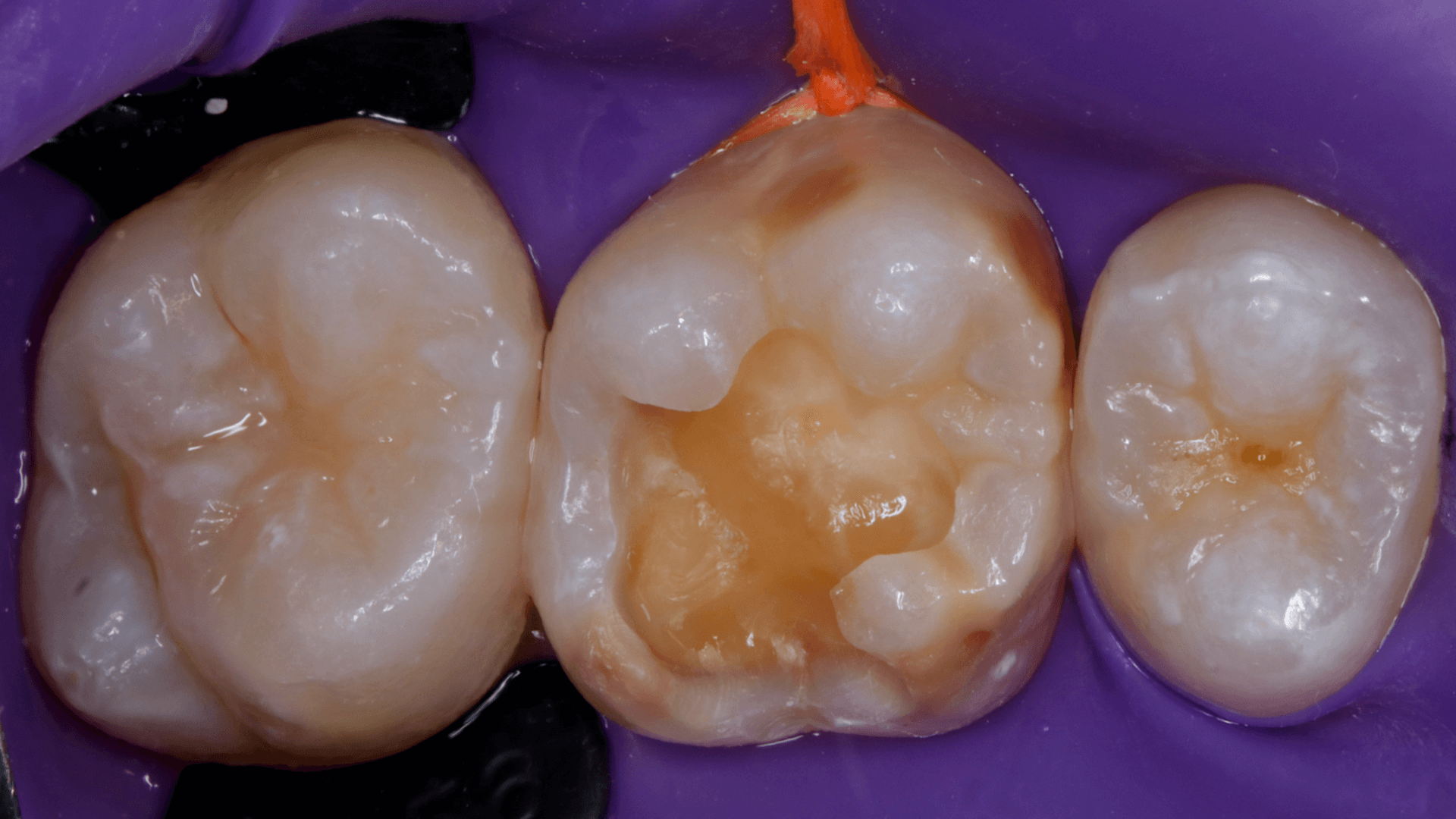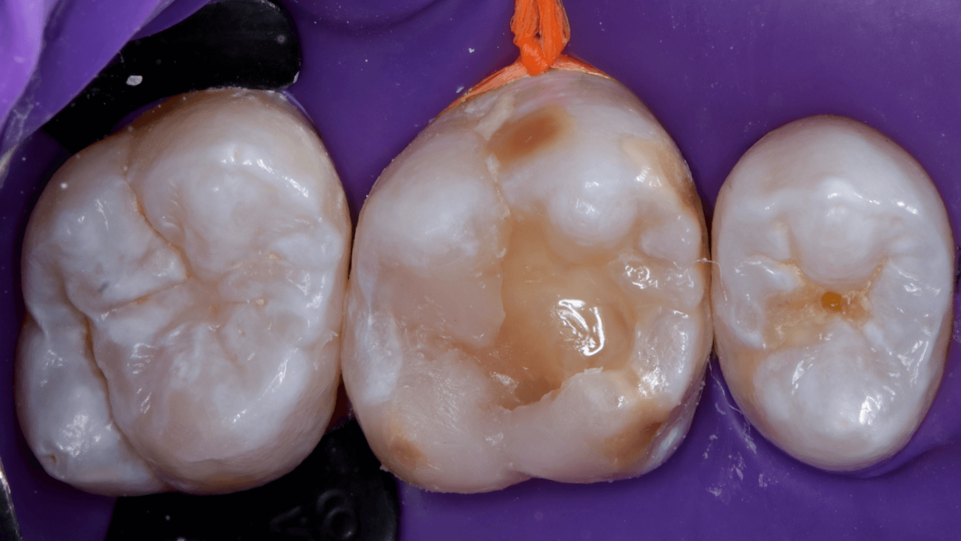 A dificuldade consistiu em restaurar o dente em questão em um curto tempo hábil, para isto foi selecionado materiais que permitem um preenchimento rápido e volumoso da porção central do dente (FiltekMR Bulkfill Flowable) associado a uma resina que possui propriedades de escultura, acabamento e polimento excelentes (Flowable e FiltekMR Universal).