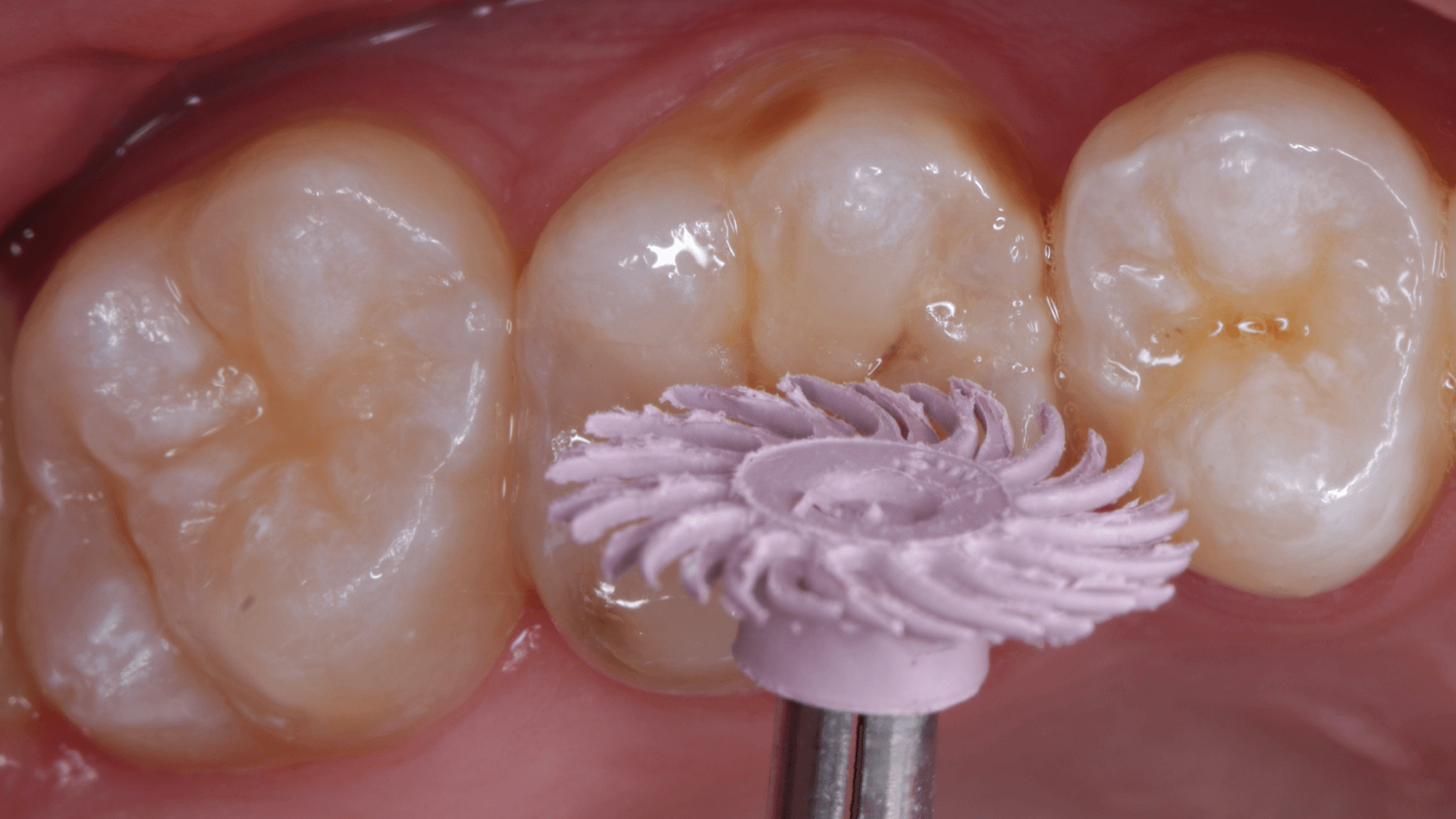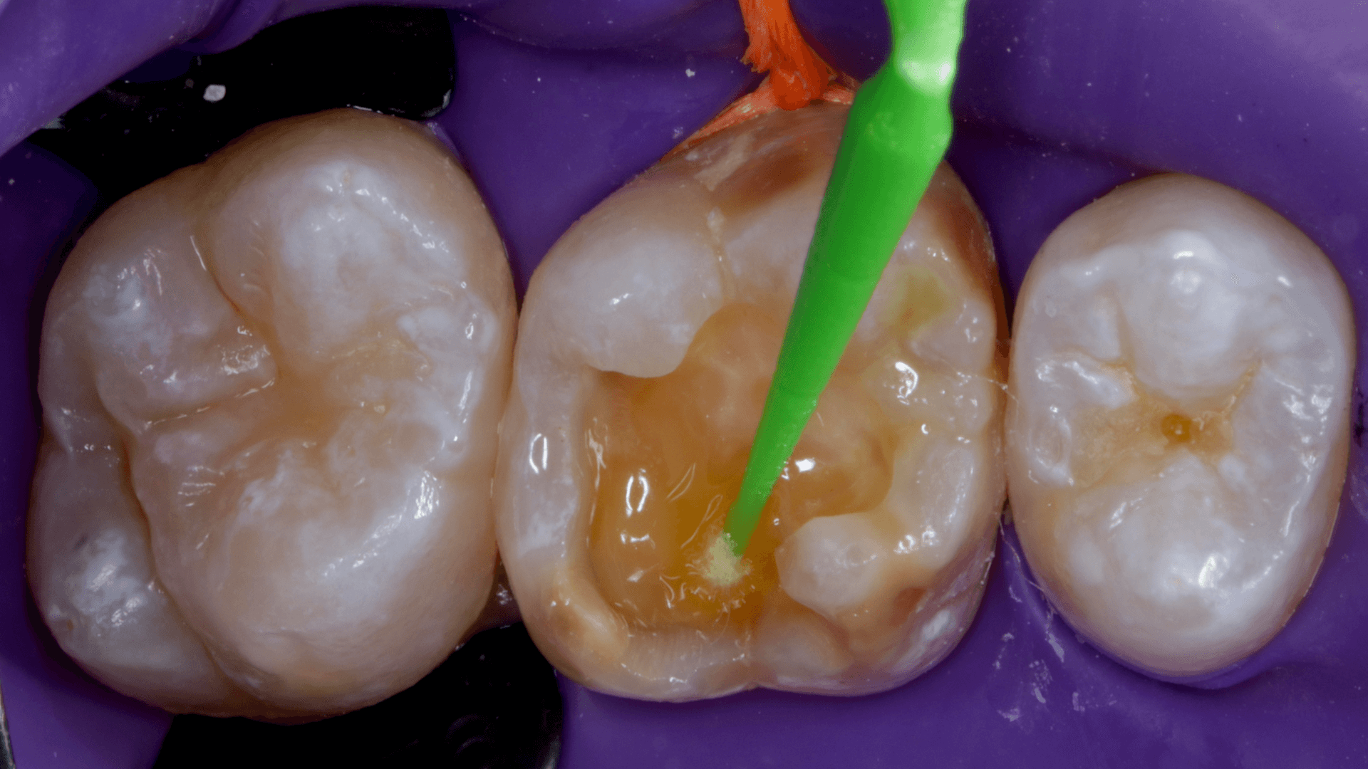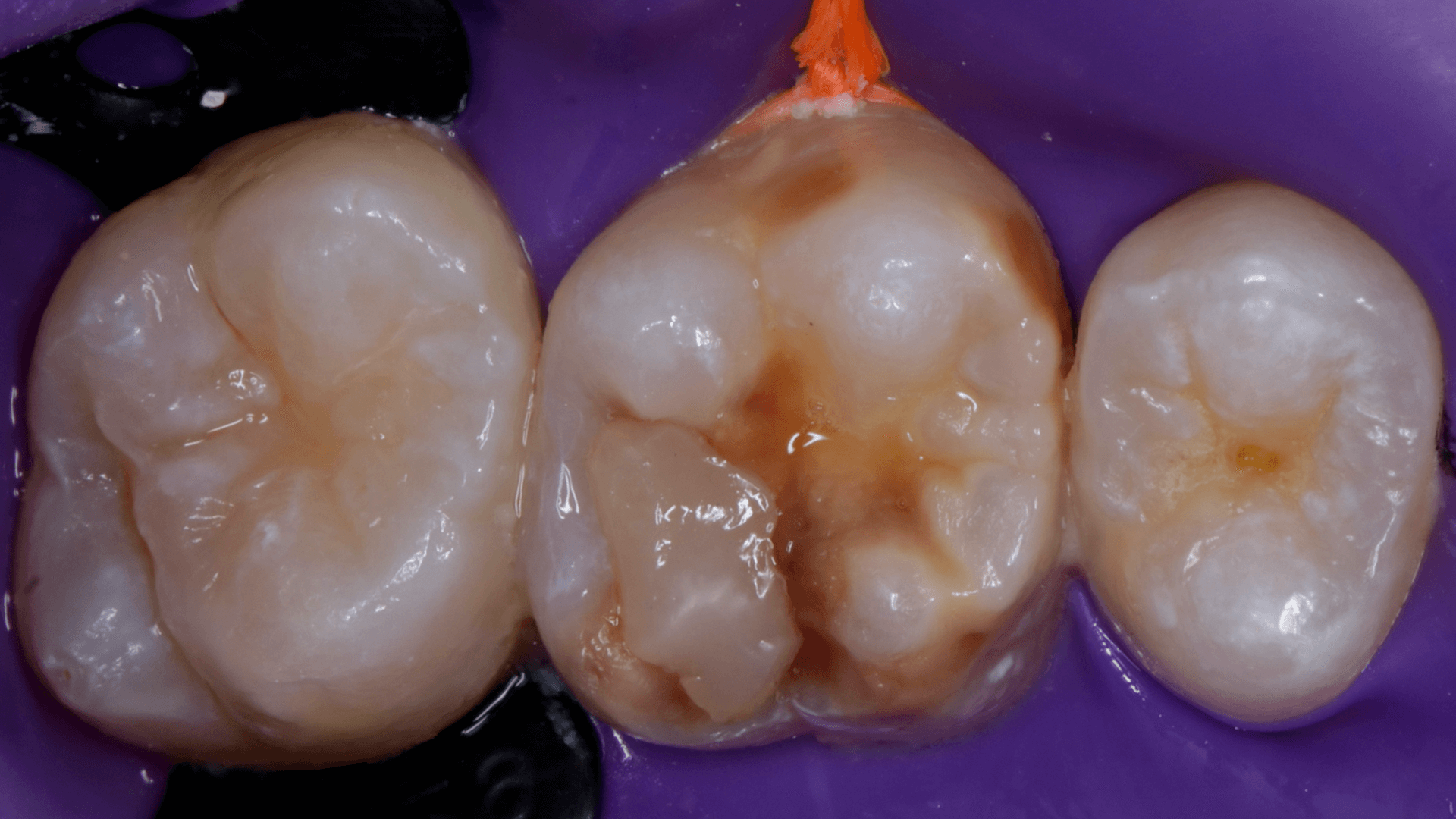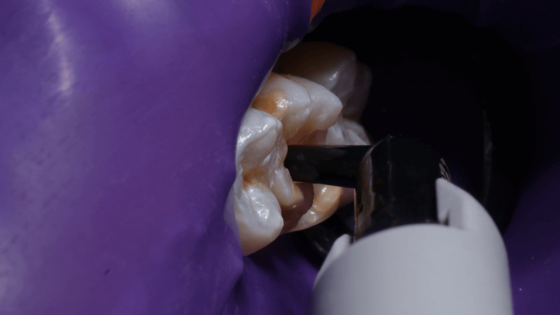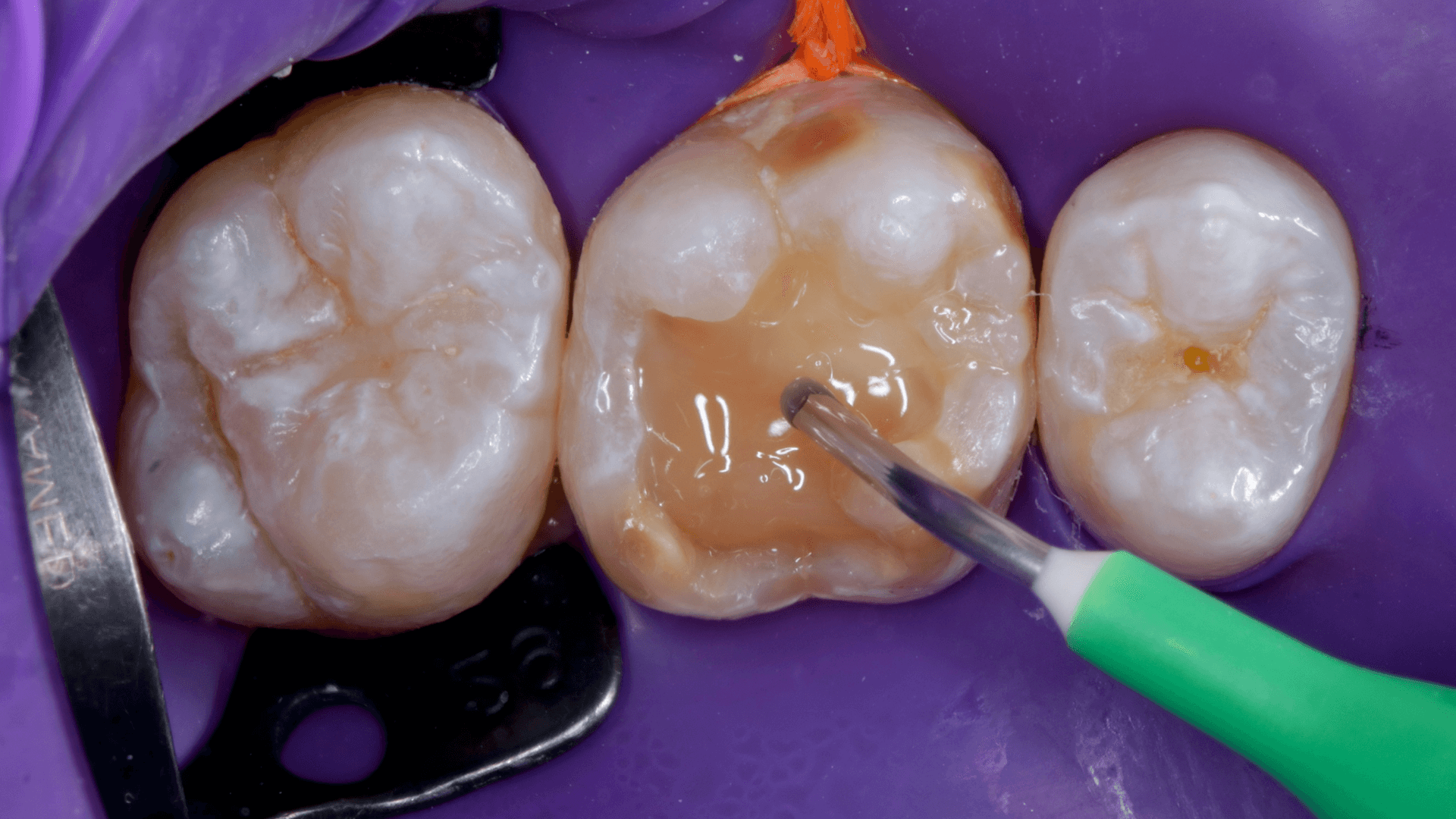A dificuldade consistiu em restaurar o dente em questão em um curto tempo hábil, para isto foi selecionado materiais que permitem um preenchimento rápido e volumoso da porção central do dente (FiltekMR Bulkfill Flowable) associado a uma resina que possui propriedades de escultura, acabamento e polimento excelentes (Flowable e FiltekMR Universal).