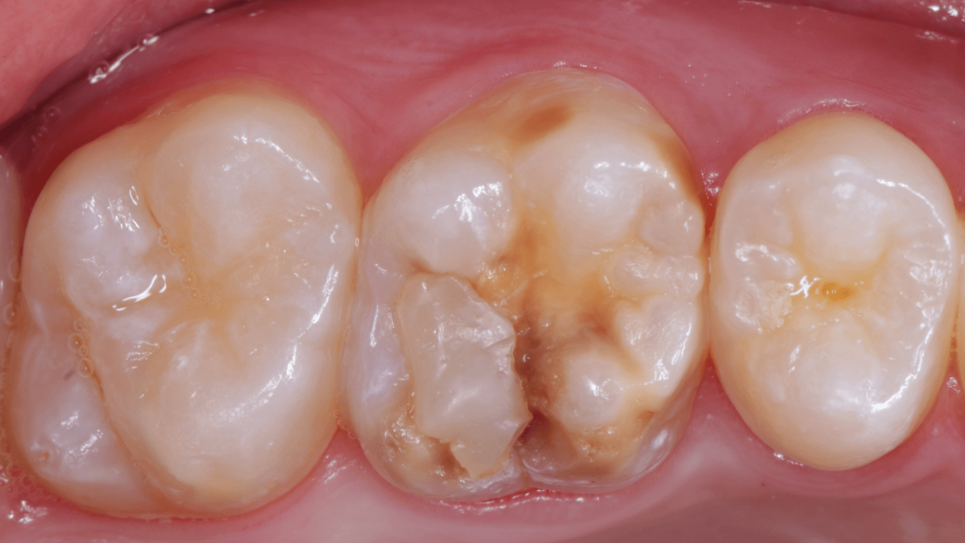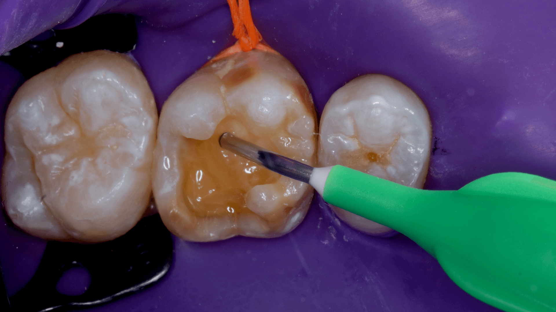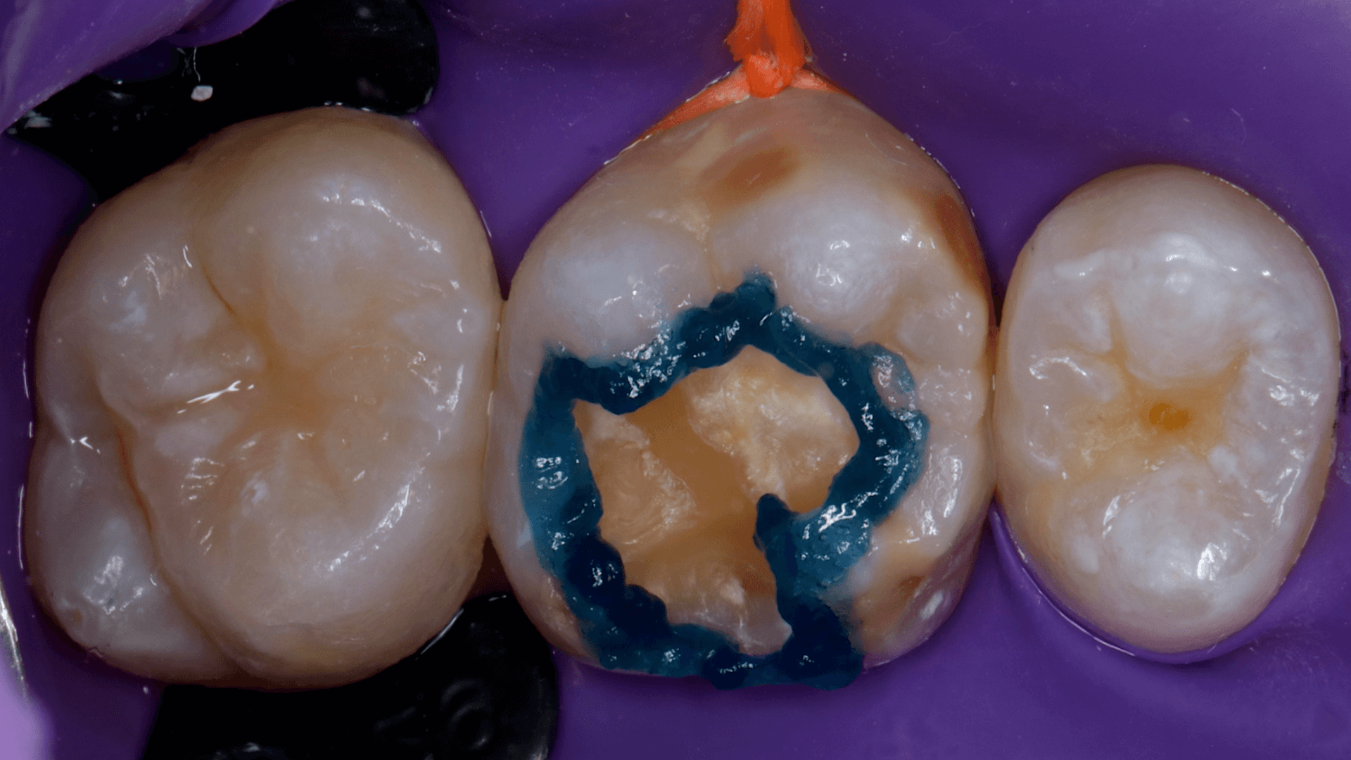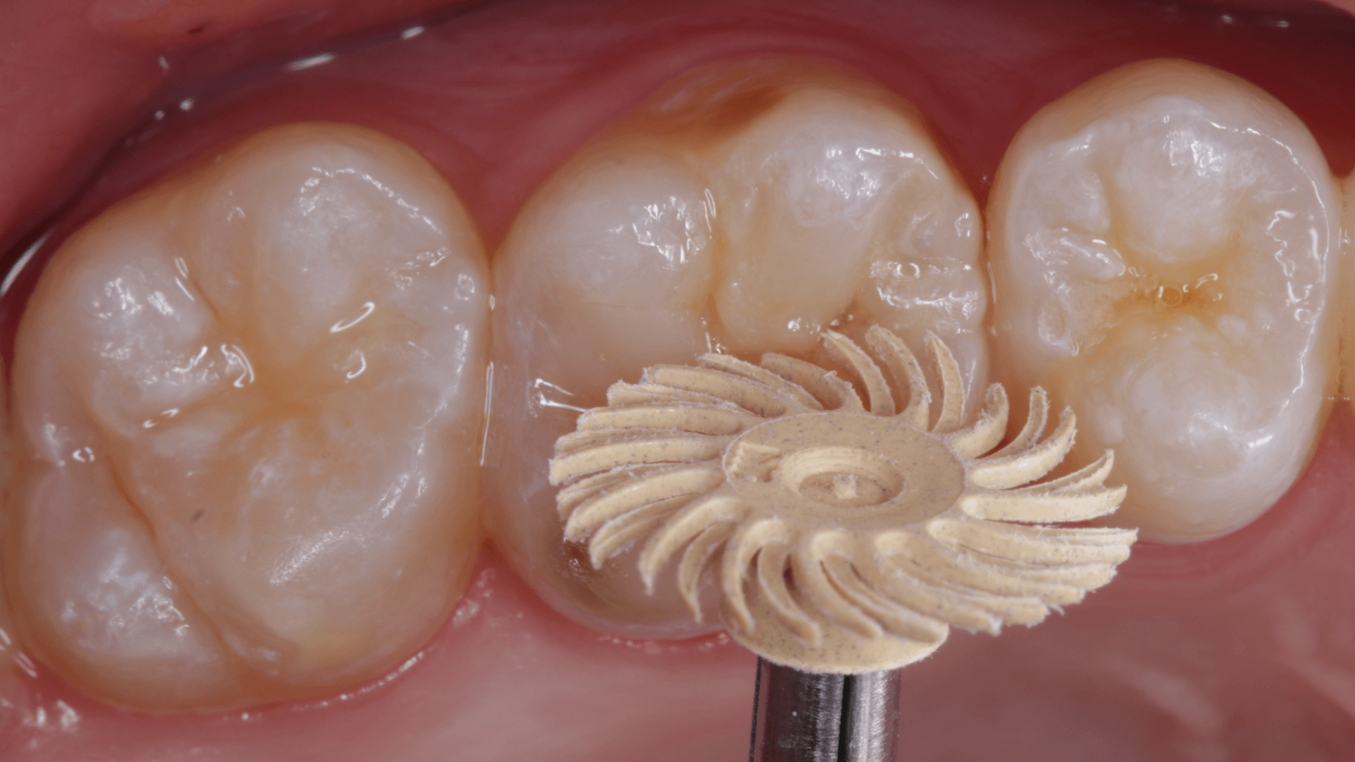 A dificuldade consistiu em restaurar o dente em questão em um curto tempo hábil, para isto foi selecionado materiais que permitem um preenchimento rápido e volumoso da porção central do dente (FiltekMR Bulkfill Flowable) associado a uma resina que possui propriedades de escultura, acabamento e polimento excelentes (Flowable e FiltekMR Universal).