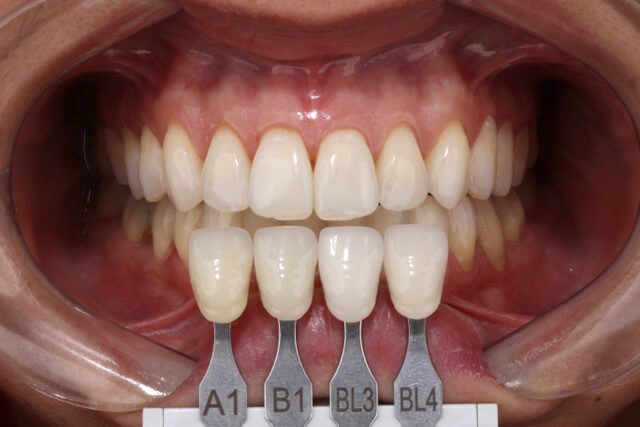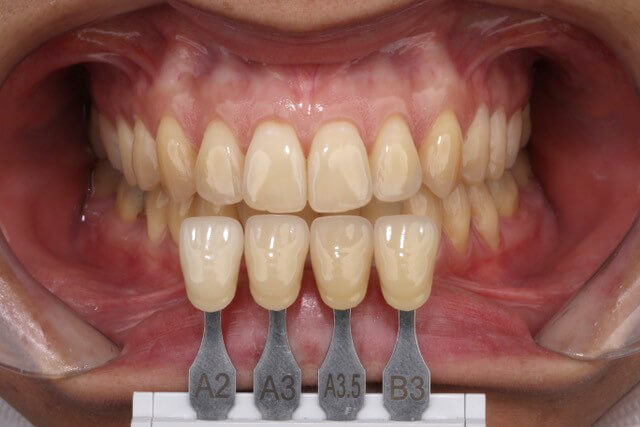 Foi realizada anamnese inicial onde a paciente não relatou nenhum tipo de sensibilidade e nenhum histórico de tentativa de procedimentos clareadores. O exame clínico mostrou periodonto saudável, ausência de restaurações anteriores e nenhuma lesão cariosa. A cor inicial identificada foi A3 nos laterais e centrais e nos caninos A3,5.