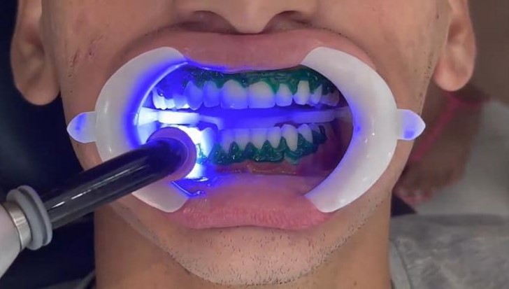 Após foi realizado a aplicação da barreira gengival e foto ativado, garantindo assim que não houvesse o contato do agente oxidante com os tecidos moles.