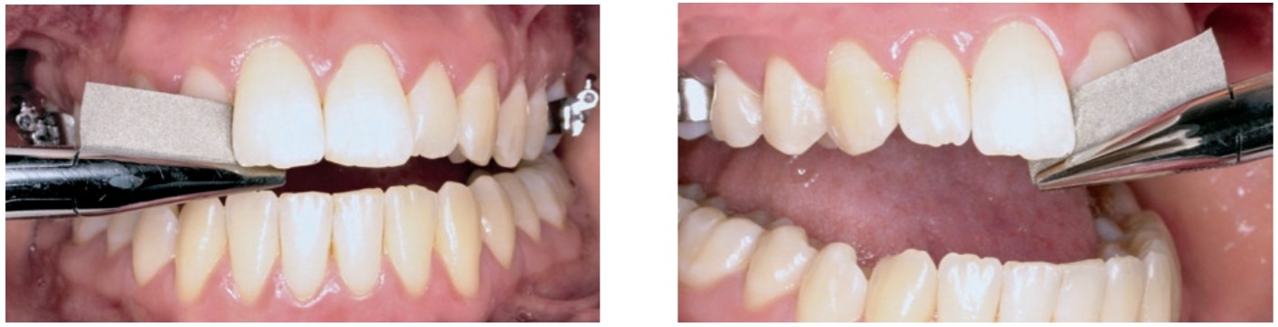 E, atenção, é sempre importante considerar que primeiro o desgaste deve ser feito nos dentes maiores, seguindo-se para os dentes menores. Em geral, é amplamente aceito que 50% do esmalte proximal é a quantidade máxima que pode ser desgastada. Além disso, vários autores preconizam o recurso a exames radiográficos, com o objetivo de avaliar a espessura do esmalte.