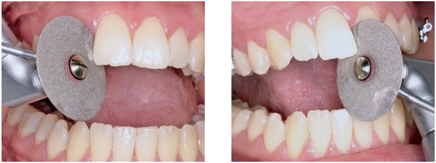 • Redução: O esmalte é desgastado com a ajuda de um instrumento abrasivo apropriado, como os discos diamantados, lixas, etc.