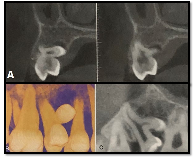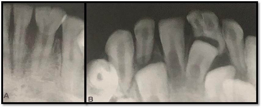 Assim, permitem a segurança ao orientar o profissional quanto ao tratamento específico do dente, juntamente com o exame clínico. Trago pra vocês um caso não tão comum de fusão de molares (Figura 3, A e B). Observem atentamente a imagem. Neste caso o diagnóstico diferencial da fusão incluem: geminação e macrodontia.