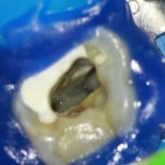 - Depois de anestesia e isolamento absoluto, realizamos o acesso endodôntico com uma broca de alta rotação 1014 de haste longa, utilizada em contra ângulo elétrico. O acesso aos canais foi complementado com inserto ultrassônico esférico com a finalidade de desgastar pouca estrutura dental para localizar os canais.
