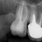 - Em seguida, relatou ter passado por um profissional que solicitou a ajuda de microscópio por não conseguir descer nos canais. Então, fizemos uma radiografia periapical onde constatou-se atresia em raiz distal, e atresia e curvatura em raiz mesial (Figura 3).