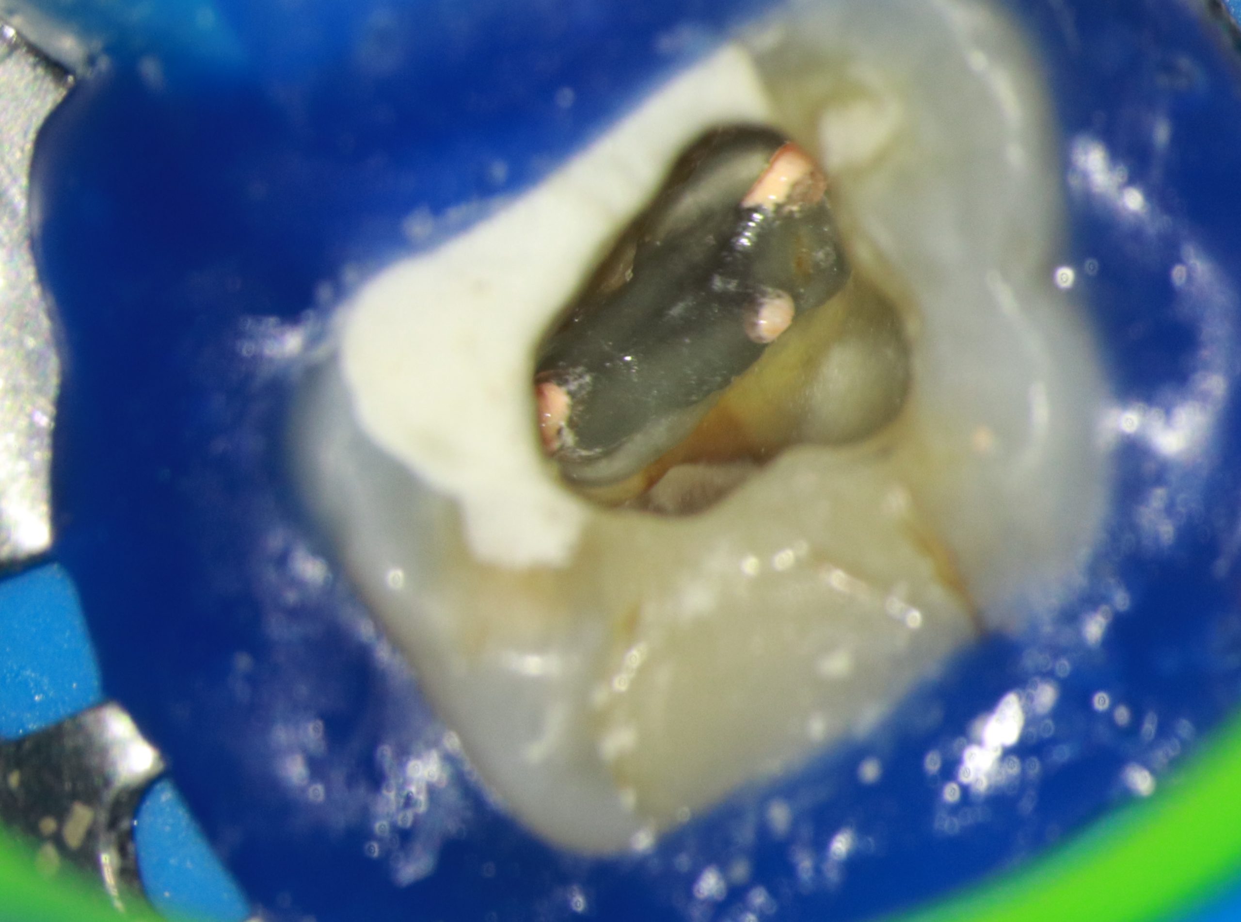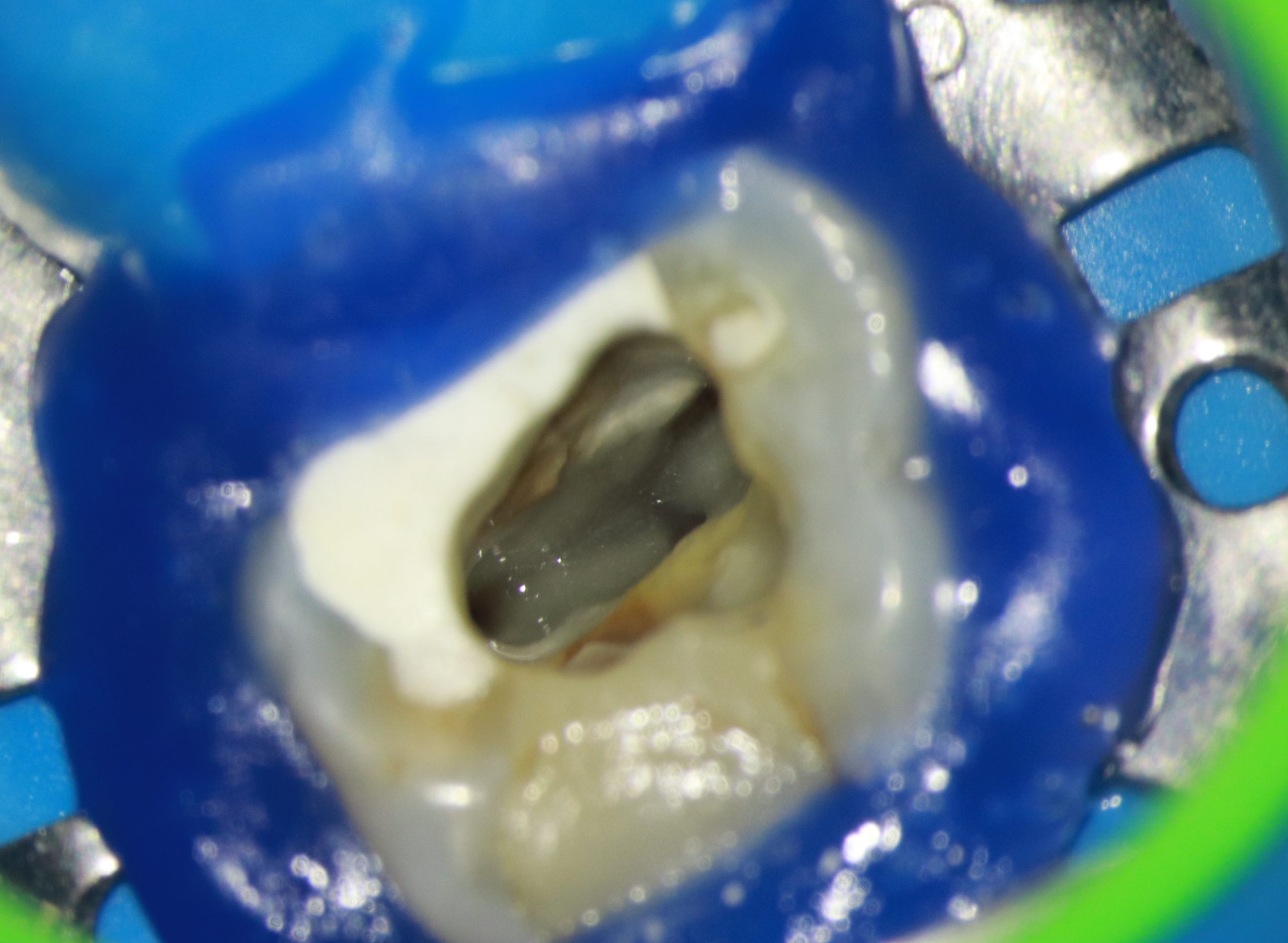 - Depois de anestesia e isolamento absoluto, realizamos o acesso endodôntico com uma broca de alta rotação 1014 de haste longa, utilizada em contra ângulo elétrico. O acesso aos canais foi complementado com inserto ultrassônico esférico com a finalidade de desgastar pouca estrutura dental para localizar os canais.