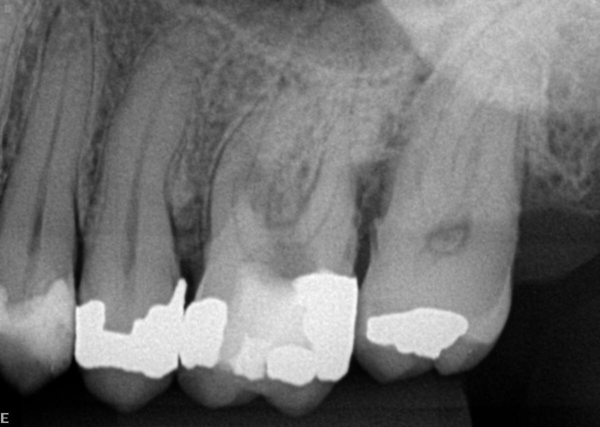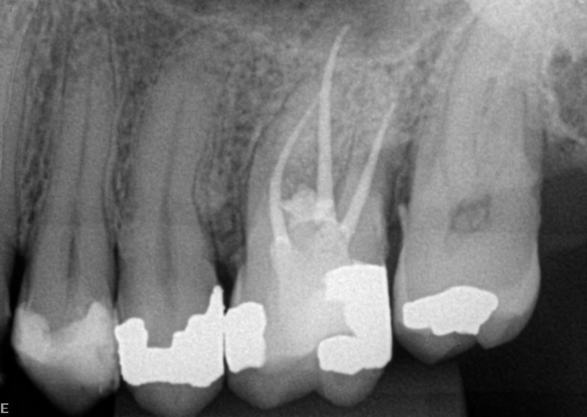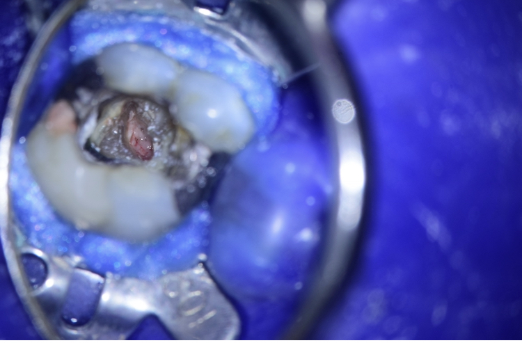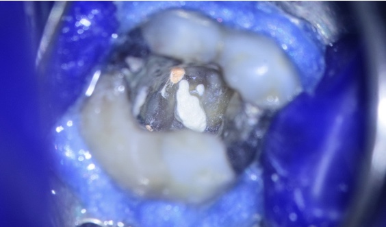 Paciente compareceu ao consultório encaminhado por um colega que executou a abertura do dente. Porém, na dificuldade de localização da câmara pulpar, acabou perfurando acidentalmente o assoalho do dente (Figura 1 e Figura 2).