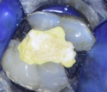A preferência é optar por materiais reparadores com presa rápida para que possamos fazer a restauração em cima desta região na mesma sessão e a obturação dos canais quando for possível (figura 5).