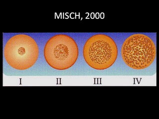 Essa classificação de Misch nos mostra os 4 tipos ósseos e suas respectivas localizações na maxila e na mandíbula. O osso tipo I é formado por cortical densa e pouco trabeculado, o tipo II possui cortical densa combinada com trabeculado grosso, o tipo III tem cortical fina e trabeculado grosso e o tipo IV é mais esponjoso deles com quase nada de cortical e osso trabecular fino.