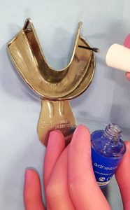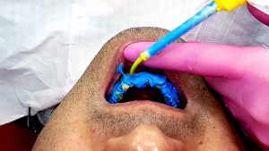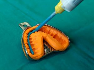 - Aplique o silicone de adição leve e pesado ao mesmo tempo, em boca, assentando a moldeira de posterior para anterior.