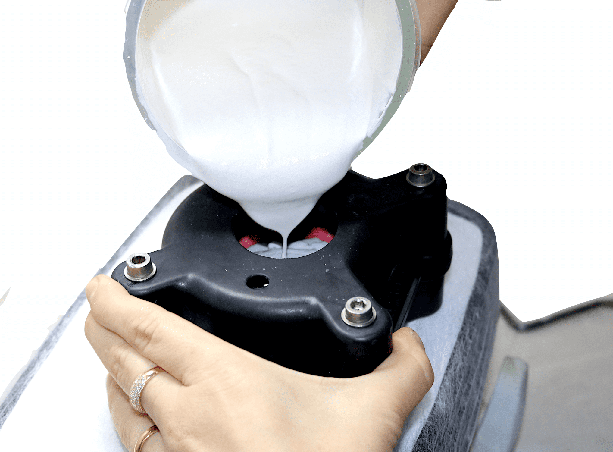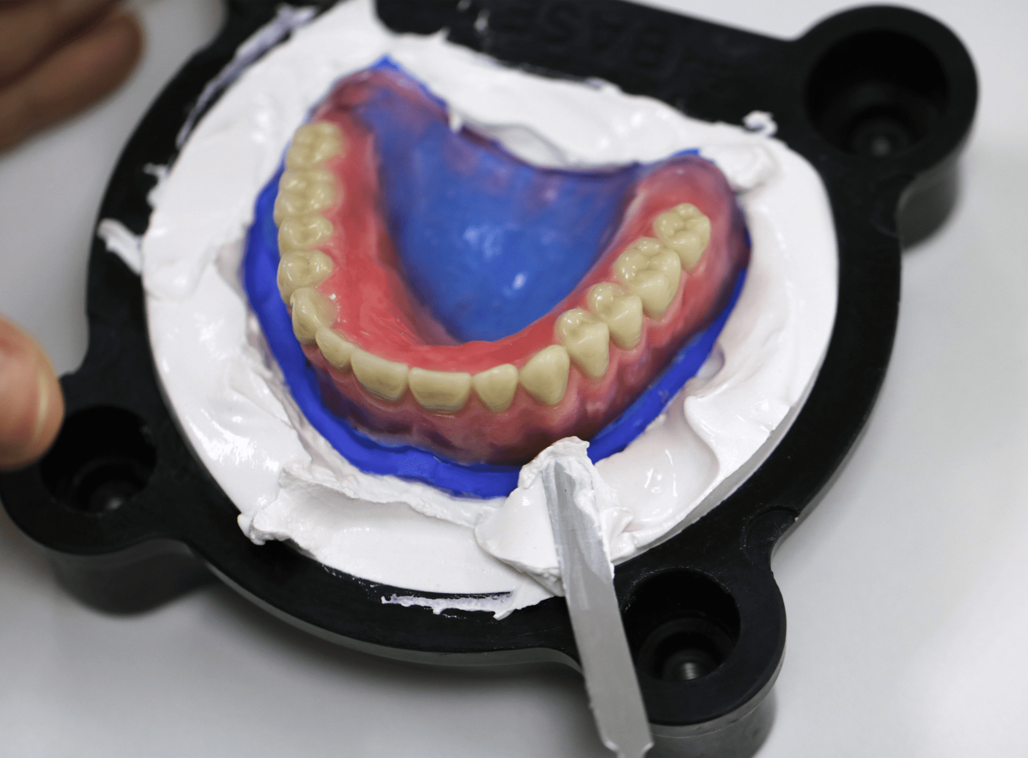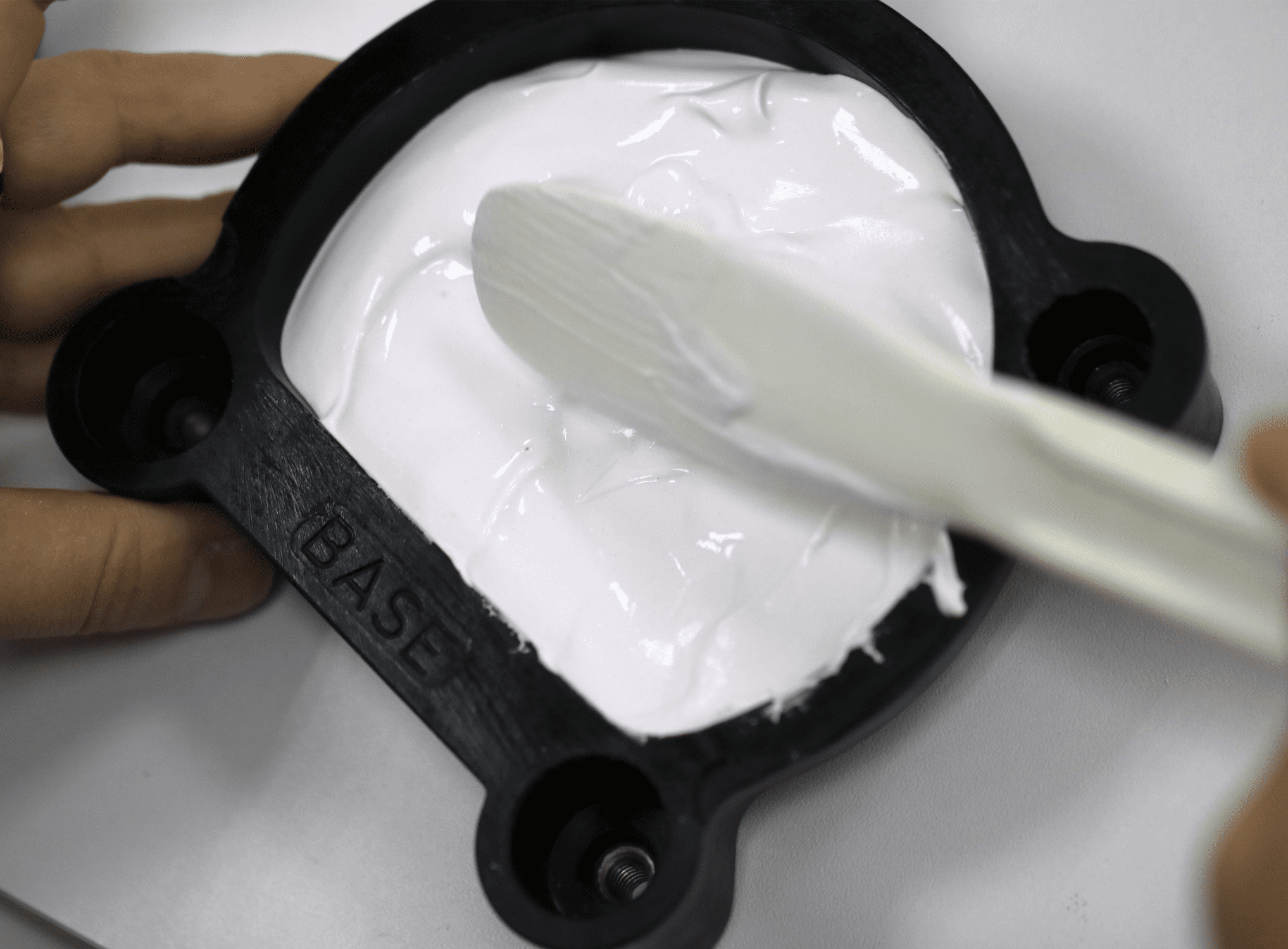 - Uma espatulação mecânica com espatulador a vácuo, traz vantagens significativas para o processo. Após o preenchimento da base da mufla, enquanto o gesso ainda está em fase de trabalho, a peça deve ser assentada sobre ele.