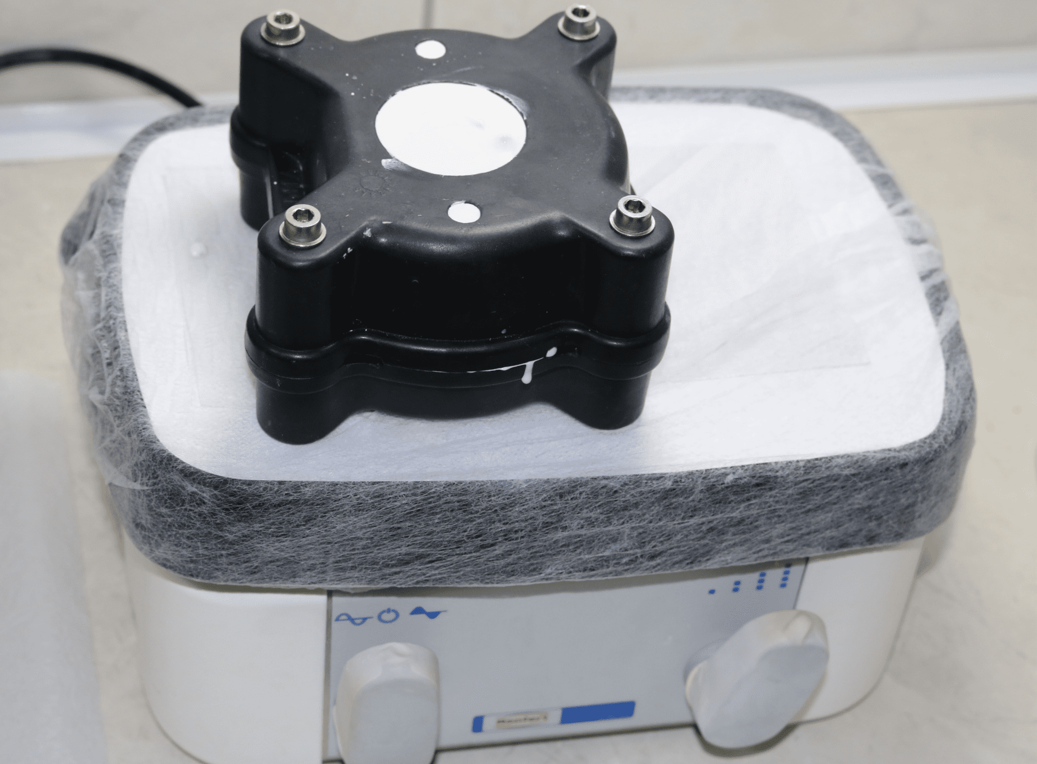 Por fim, a contra-mufla deve ser presa com os parafusos e deve ser feito o preenchimento do restante, com gesso adequado. Expansão de gesso em mufla é algo totalmente indesejável, já que se utiliza uma grande quantidade para preencher.